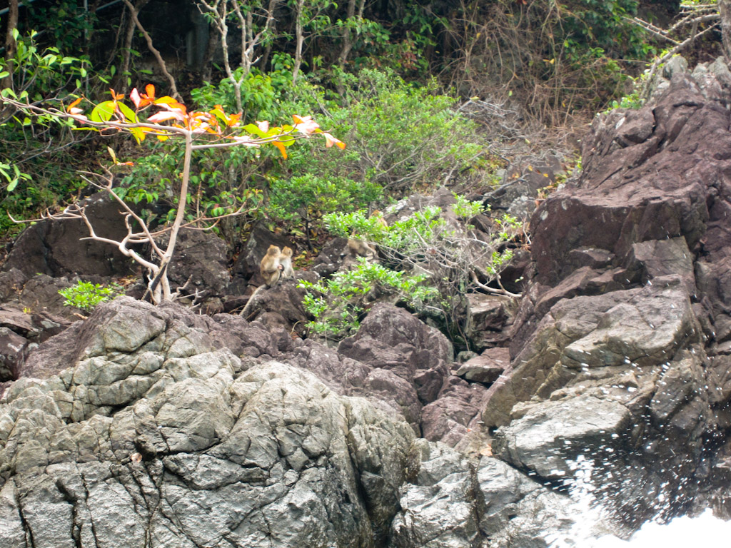 Mächtiger glatter Seegang der kräftig gegen die Felsküste schlägt. Darüber Dschungel und Affen die uns beobachten.