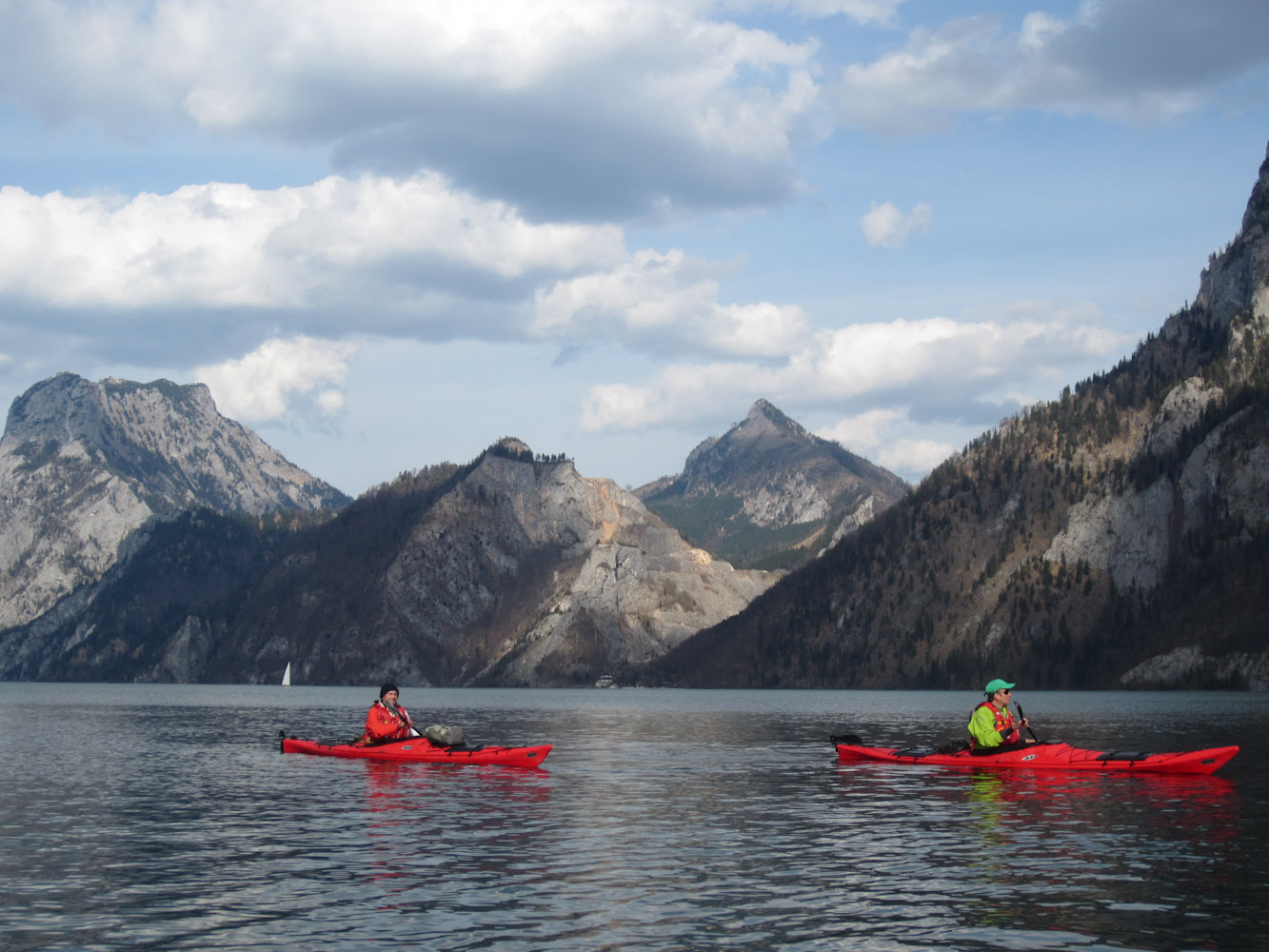 Frühlingstag, 22 °, Sonne, leichter Wind, perfekte Kulisse mit Schneegipfel und blühendem Gebüsch, frischgrünen Wiesen und glasklarem Wasser. Einstieg in Gmunden Ost bei der Steganlage vom Kajakladen. Route entlang der Ostseite unterm Traunstein. Mittagspause auf den Grundfesten einer vergangenen Gaststätte der Holzknechte, dort legen aber auch die einzigen 2 Motorboote des Tages an… das Wetter macht versöhnlich. Der bessere Rastplatz zeigt sich dann eine Ecke weiter, auch ehemalige Grundfesten – möglicher Zeltplatz…